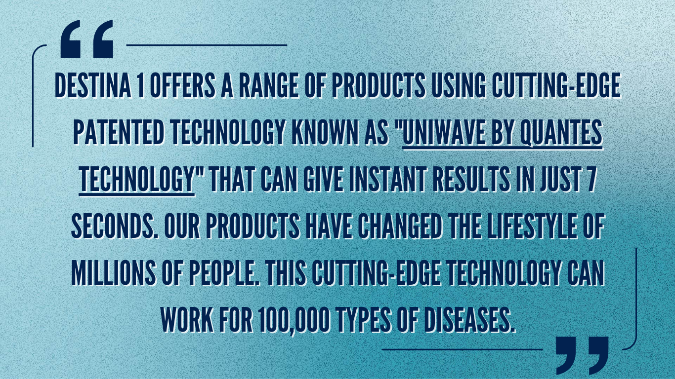 Come and explore the most excellent opportunity of your lifetime! Making your dream a reality. Destina 1 International is all set to launch the platform globally. A platform with cutting-edge technology designed exclusively to create more healthy and wealthy people worldwide. So get in now as a pioneering founding member and create a new history by transforming yourself into a successful Social Entrepreneur. Be a life changer and save people’s lives!